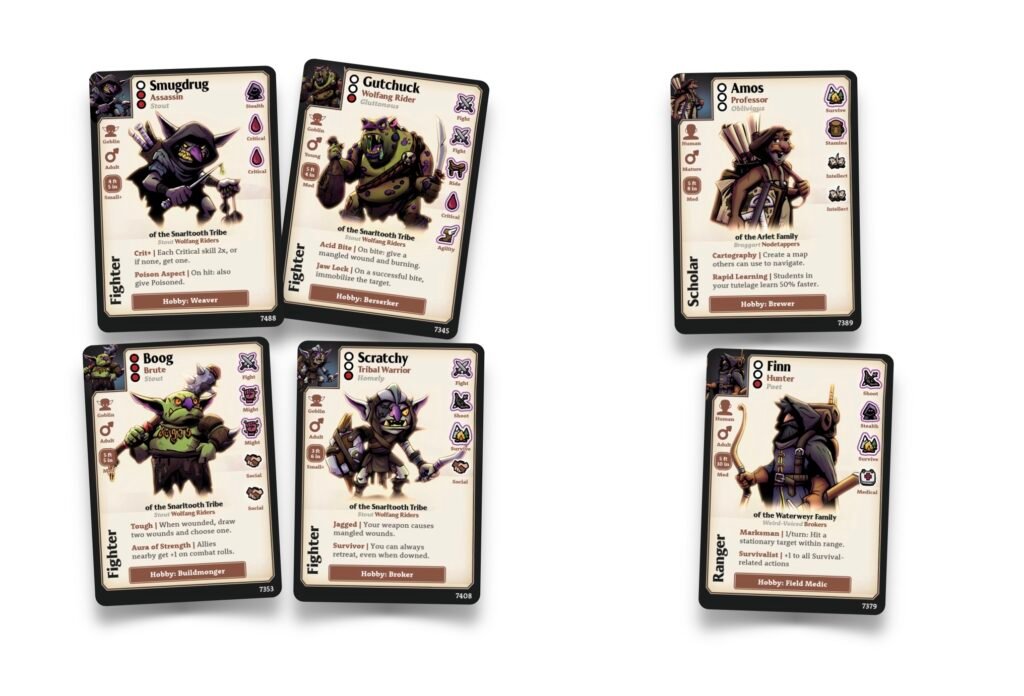 Wistblade was originally envisioned as an endless sandbox with digital tools that would help anyone generate 10,000 NPCs quickly and beautifully, and then organize and database them on your computer. But as the project has evolved I’ve had to cut things that are beyond a realistic scope, and the digital side got cut back in January. Wistblade became a card game because cards offer a lot of similar databasing options as computers, with some advantages to boot.