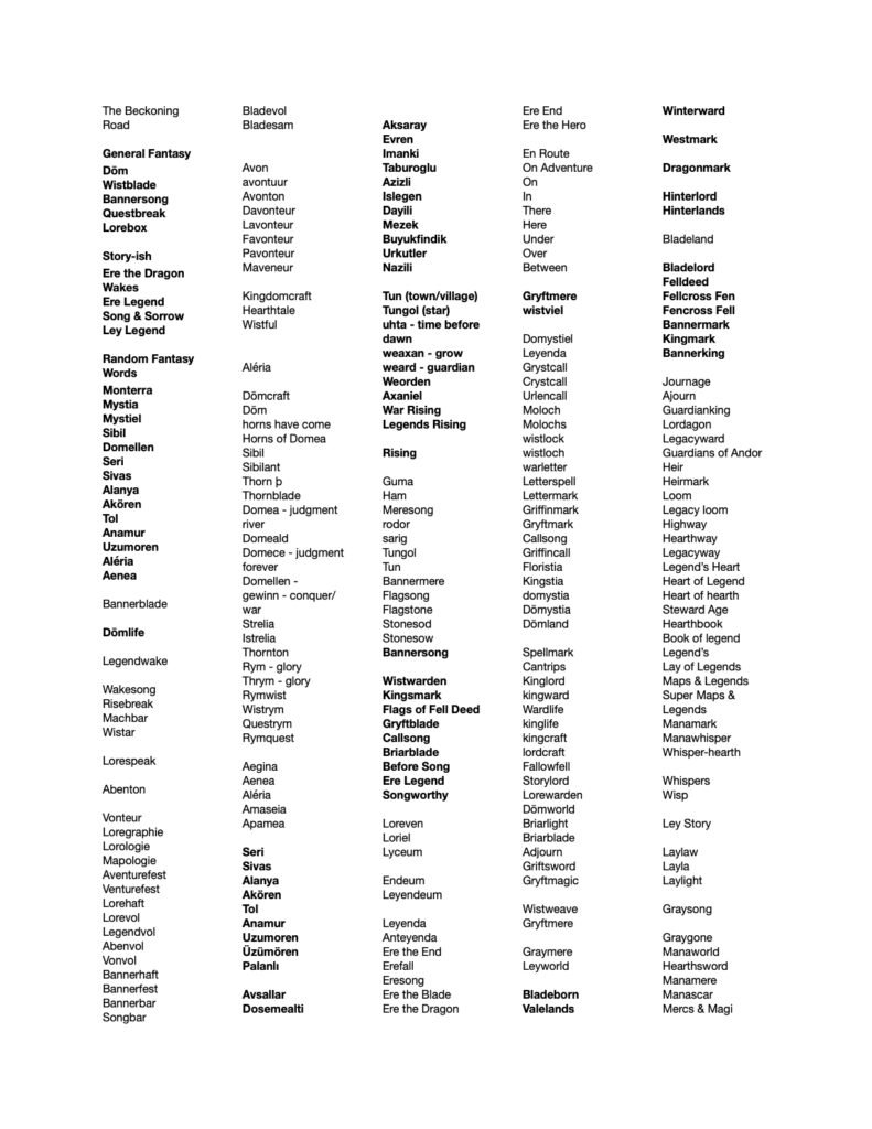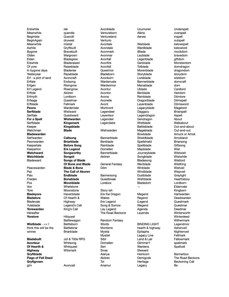 Here I was exploring kingly names as I just liked the feel and I knew in my heart I’d have to let go of the original name. Some of them are just random fantasy names I liked.